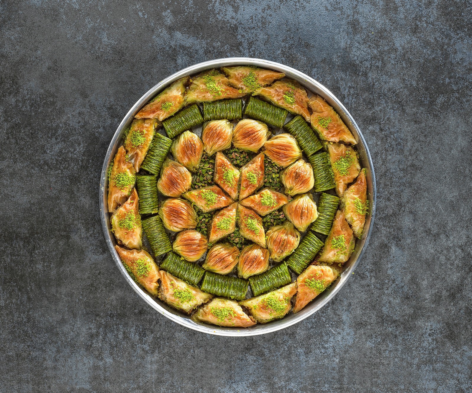 Tepsi içi ürün çeşitleri: Fıstıklı şöbiyet, Fıstıklı dürüm, Midye baklava, Mekik dilim baklava